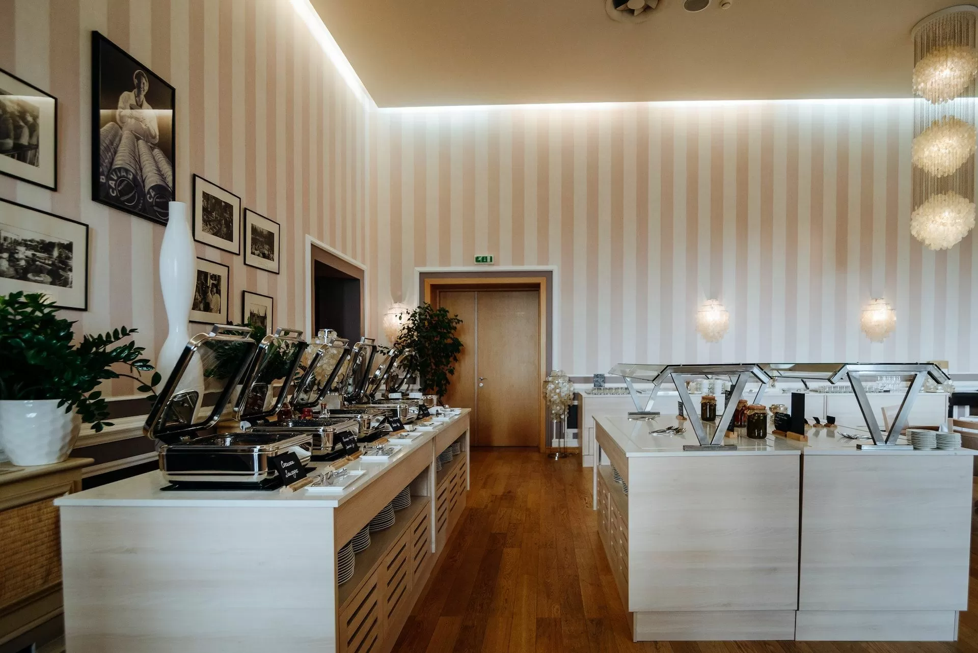 Элегантный зал выдержан в светлых тонах. Фотографии старинных московских улиц. Бра из перламутровых пластин тонко звенят от каждого движения воздуха. Все это создает атмосферу старой доброй столицы.