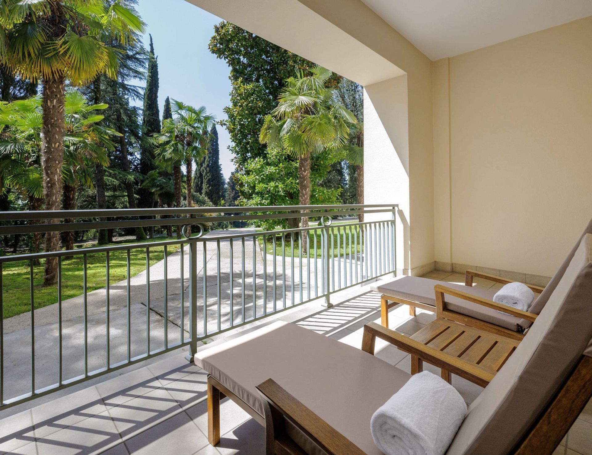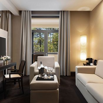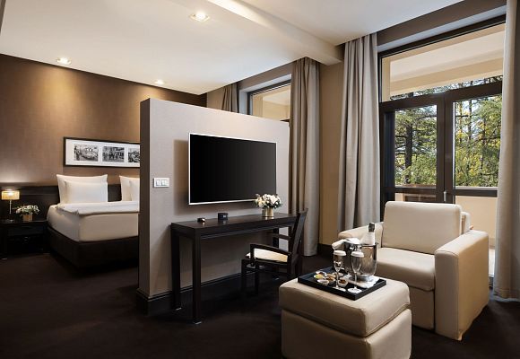 Этот просторный и комфортабельный номер выполнен в классическом стиле. Интерьер в сдержанной гамме элегантно обращает ваше внимание к живописному виду на парк. Дизайнерская платформа разделяет пространство на спальную и гостиную. Большая панорамная терраса приглашает насладиться солнечными ваннами или созерцанием звездного неба.