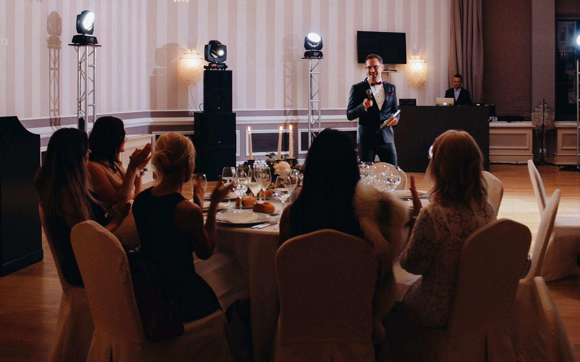 В программе вечера была живая классическая музыка в исполнении музыканта на рояле, танцы-Полонез, Мазурка, Вальс, а также интерактивная программа с конкурсами и подарками.