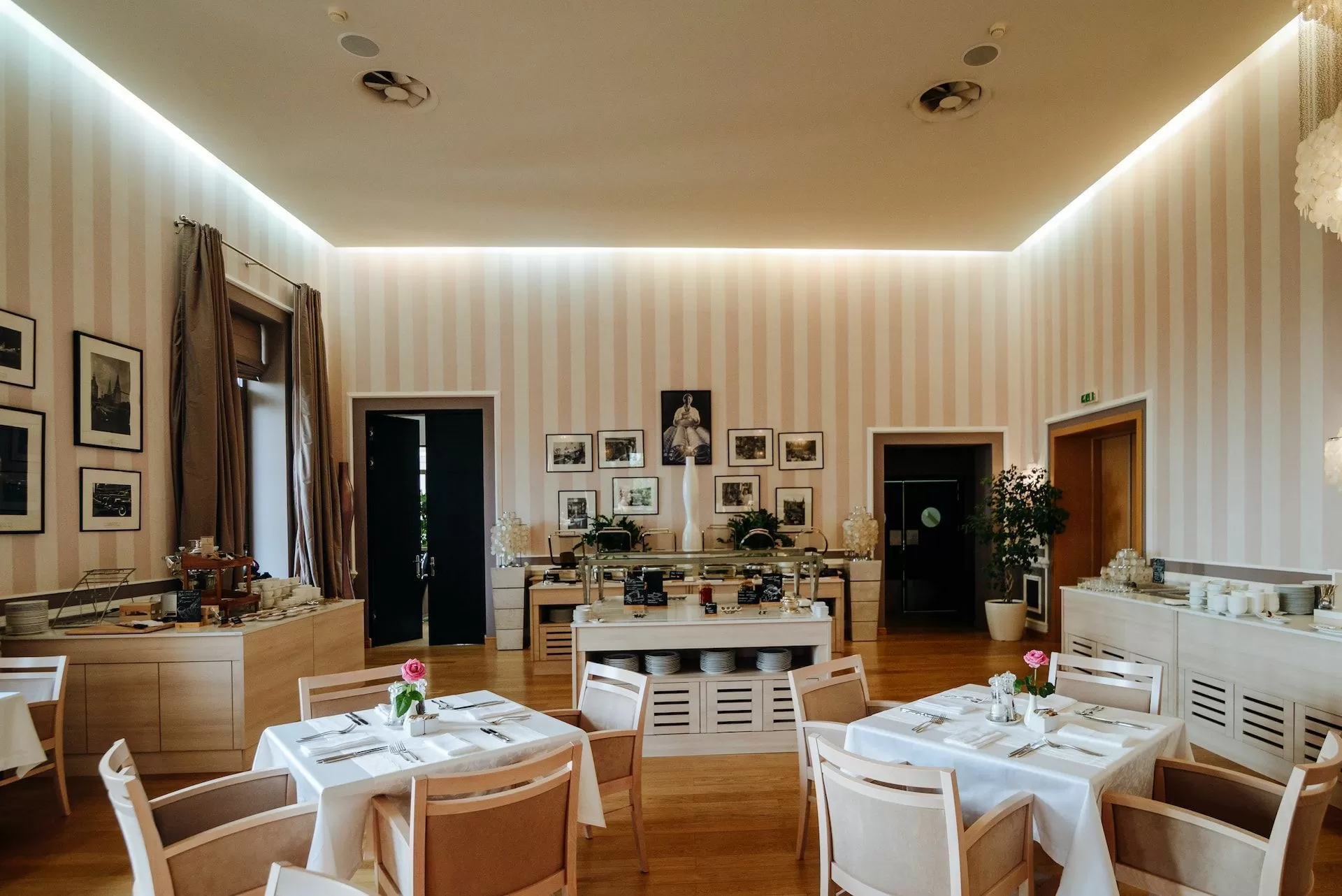 Элегантный зал выдержан в светлых тонах. Фотографии старинных московских улиц. Бра из перламутровых пластин тонко звенят от каждого движения воздуха. Все это создает атмосферу старой доброй столицы.